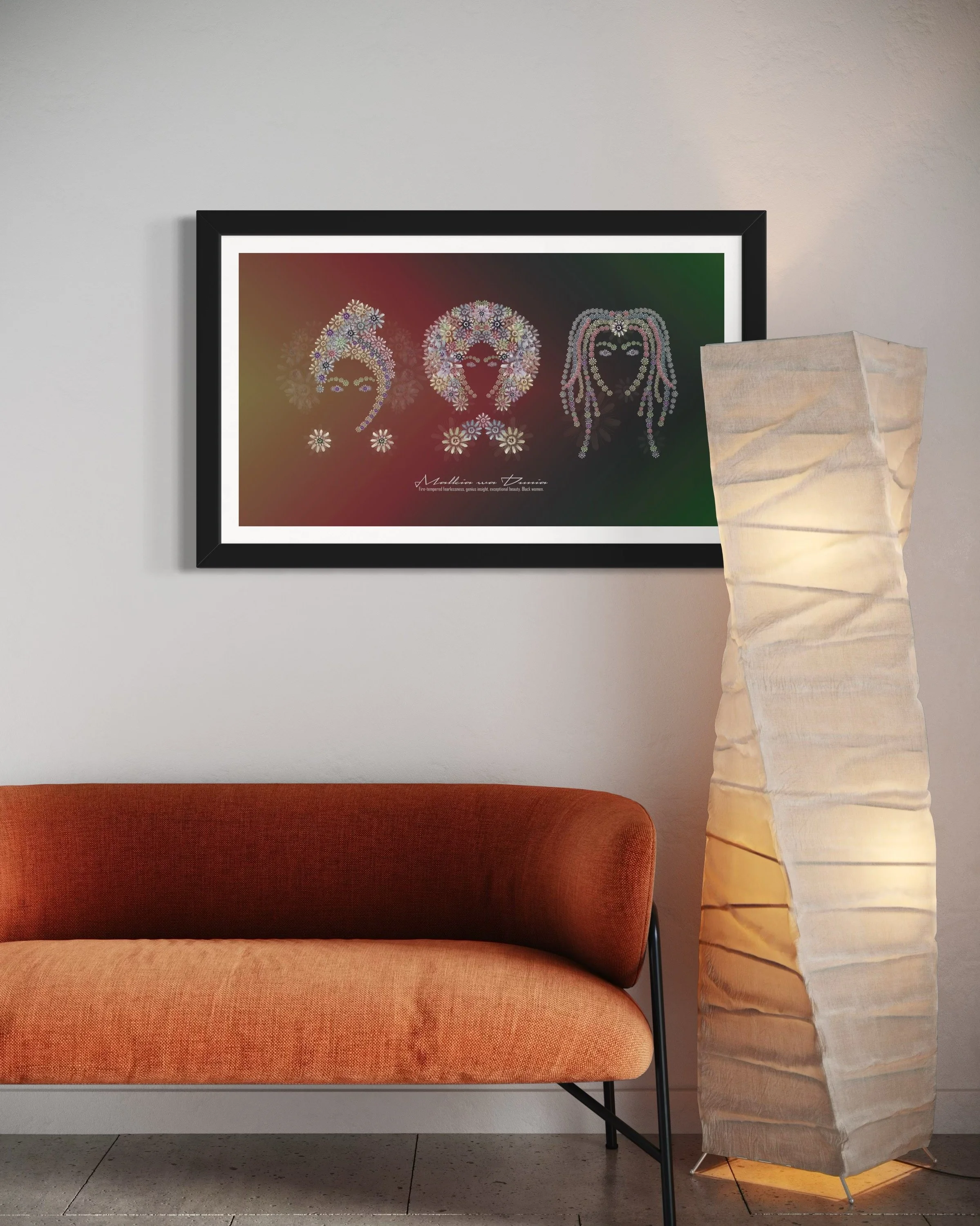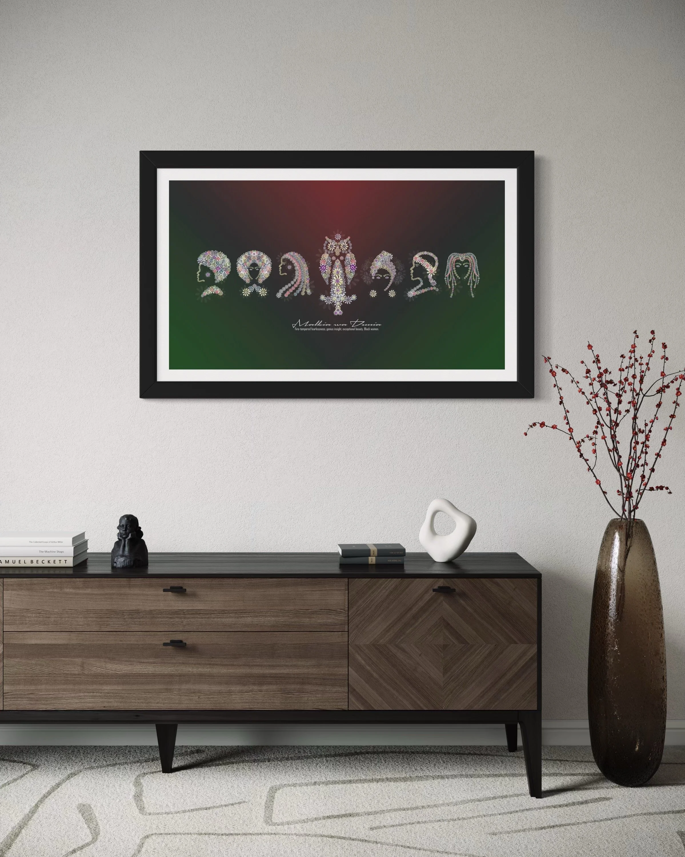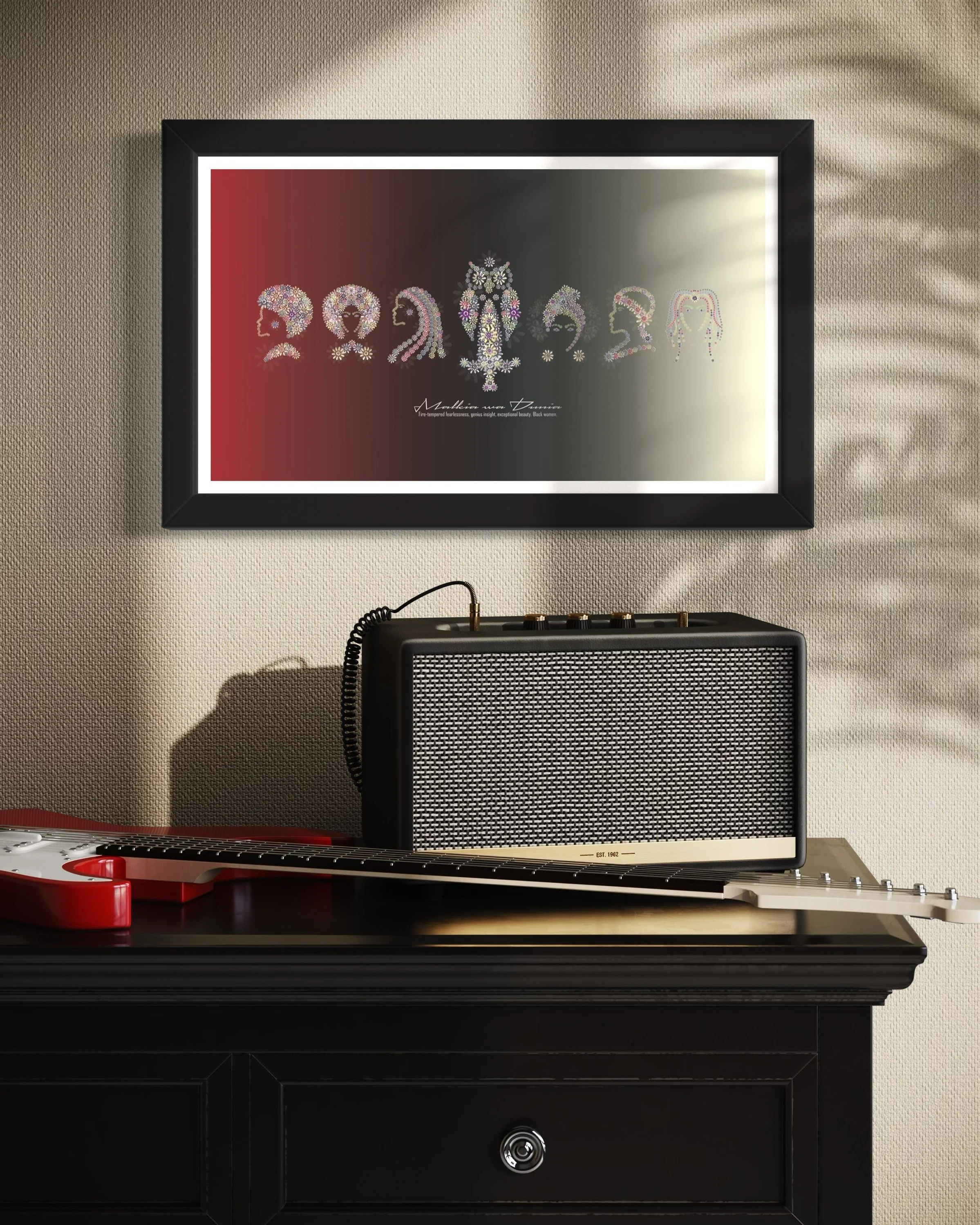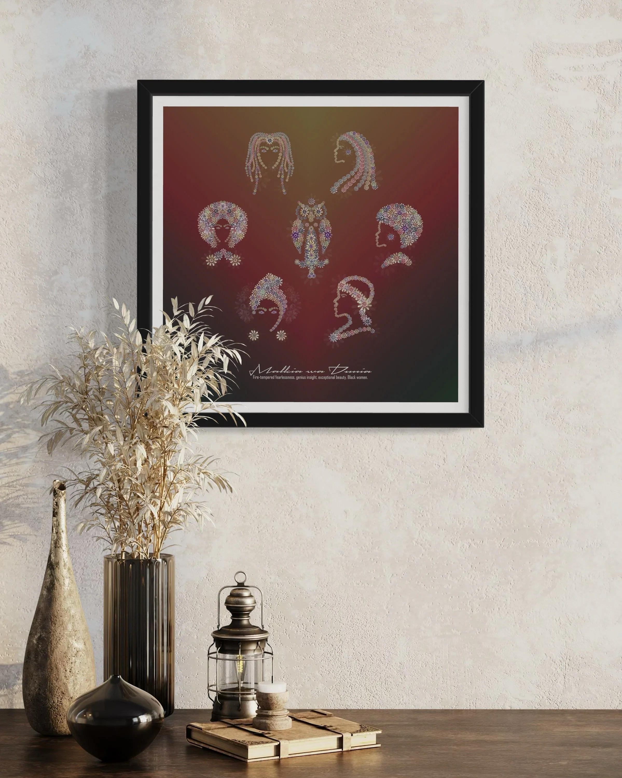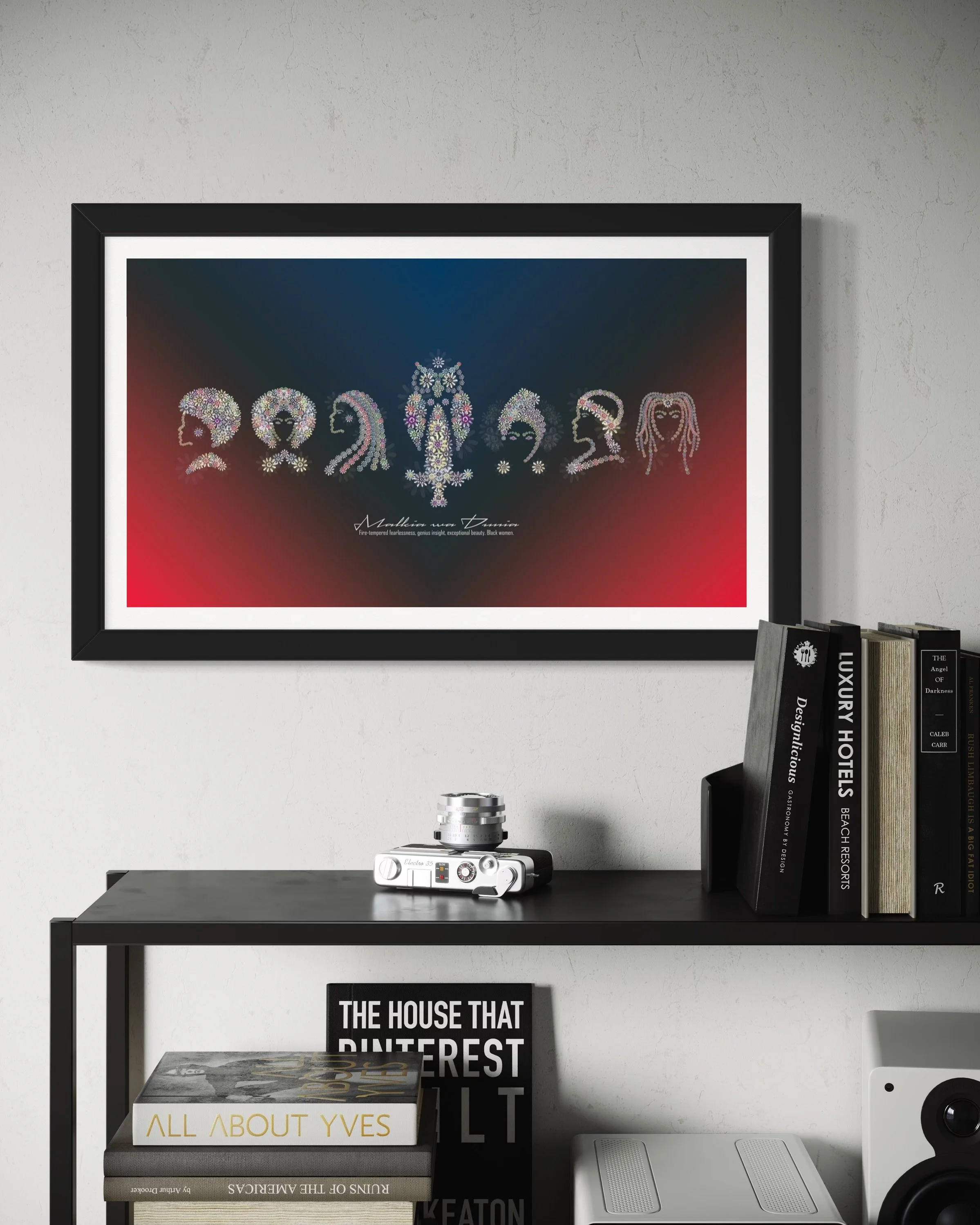 These compositions were envisioned to magnify the majesty of the Queens, presenting them in grand, expansive form. As with other pieces in the collection, this offering is available with diverse backdrop choices in diasporic heritage tones.