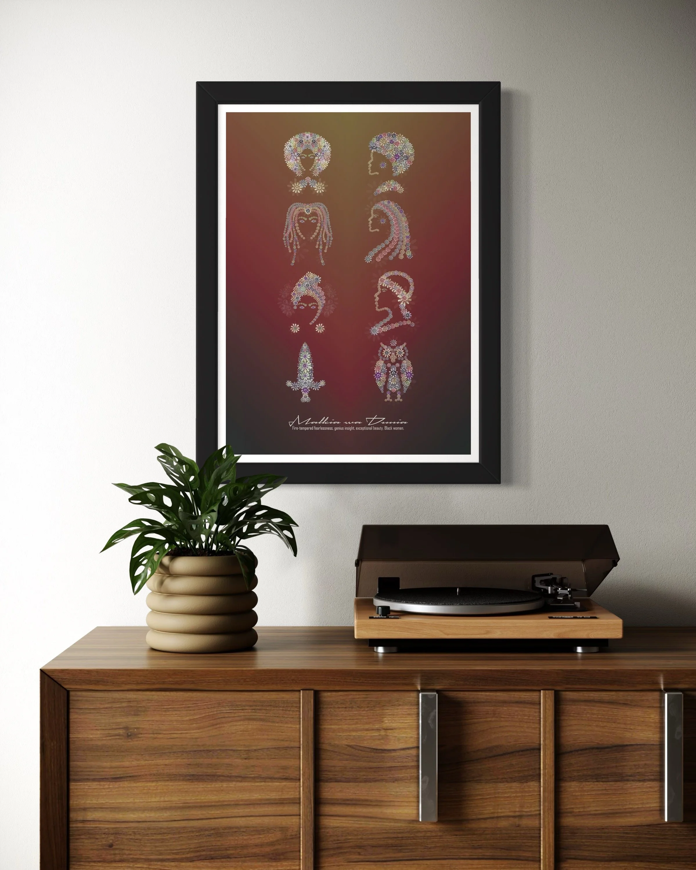 Diaspora is an expansive interpretation of Malkia wa Dunia. These offerings are meant to sprawl across your living space the way Black Queens starting with Earth’s first female, Lucy, have sprawled across time. What makes Diaspora unique is the symbols of intellect and bravery brackets the Queens on each end. Read more at #malkia